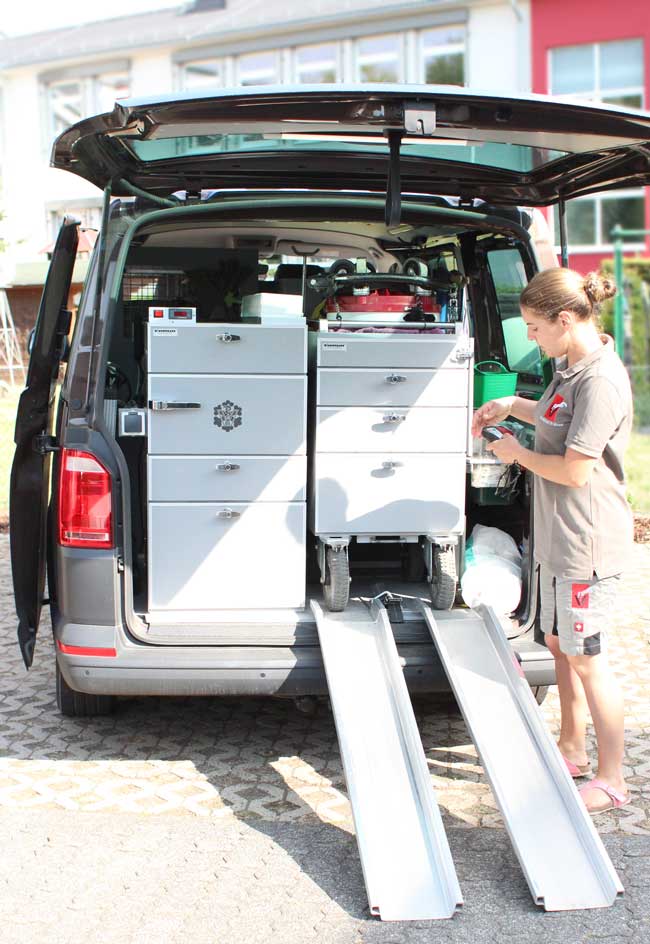 Die Fahrzeuge, die wir für die Zahnheilkunde einsetzen, sind mit einem sogenannten Zahnwagen ausgestattet. Mit dessen Hilfe können wir alles notwendige Equipment, die Maschinen und Instrumente immer direkt in den Stall und zum Patienten verbringen.